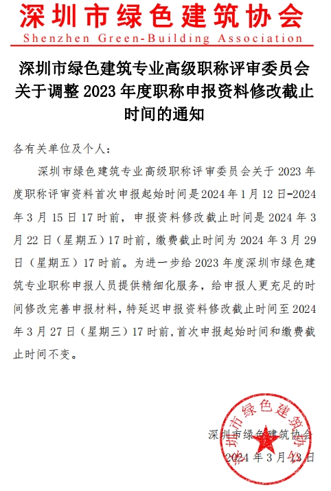 深圳市綠色建筑專業(yè)高級職稱評審委員會關(guān)于調(diào)整2023年度職稱申報(bào)資料修改截止時間的通知