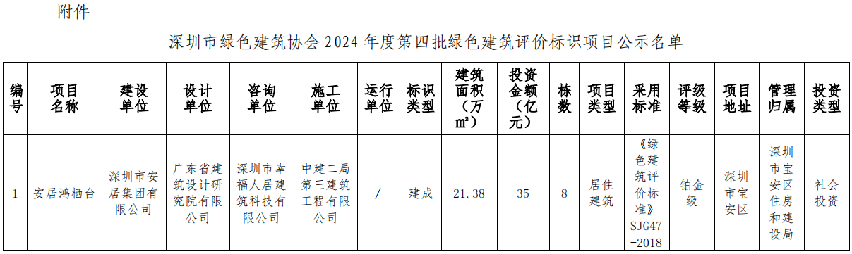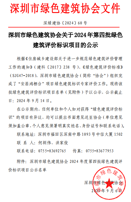 深圳市綠色建筑協(xié)會關于2024年第四批綠色建筑評價標識項目的公示