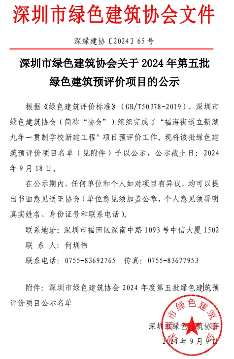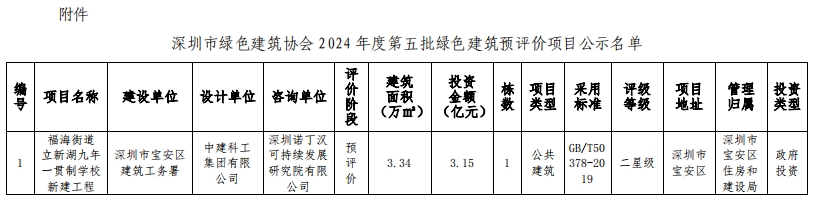 深圳市綠色建筑協(xié)會(huì)關(guān)于2024年第五批綠色建筑預(yù)評價(jià)項(xiàng)目的公示