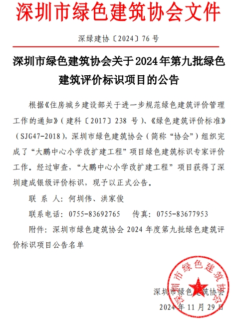 深圳市綠色建筑協(xié)會(huì)關(guān)于2024年第九批綠色建筑評(píng)價(jià)標(biāo)識(shí)項(xiàng)目的公告