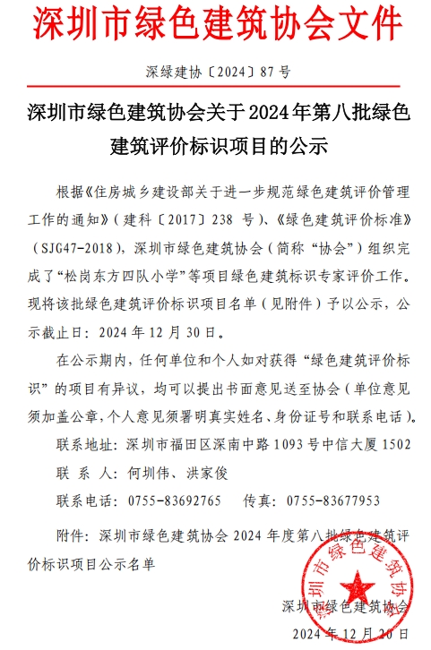 深圳市綠色建筑協(xié)會(huì)關(guān)于2024年第八批綠色建筑評(píng)價(jià)標(biāo)識(shí)項(xiàng)目的公示