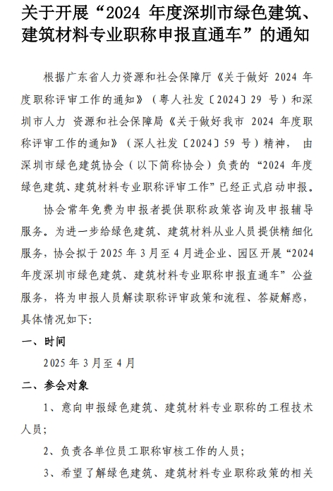 關(guān)于開展“2024 年度深圳市綠色建筑專業(yè)、建筑材料專業(yè)職稱申報直通車”的通知