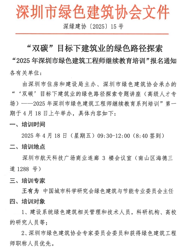 “雙碳”目標(biāo)下建筑業(yè)的綠色路徑探索——“2025年深圳市綠色建筑工程師繼續(xù)教育培訓(xùn)”報(bào)名通知