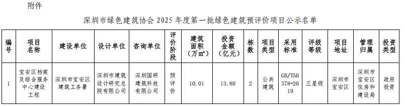 深圳市綠色建筑協(xié)會關于2025年第一批綠色建筑預評價項目的公示
