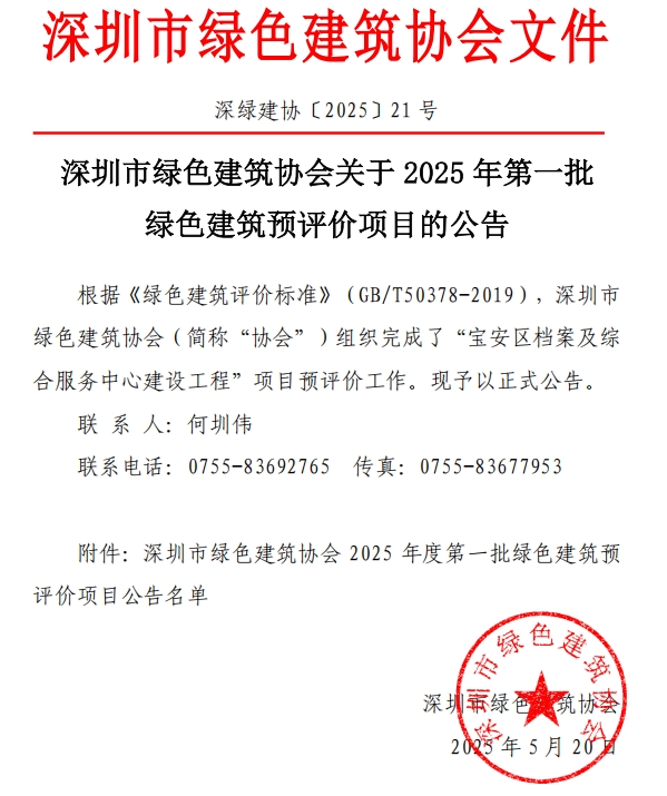 深圳市綠色建筑協(xié)會關(guān)于2025年第一批綠色建筑預(yù)評價項目的公告