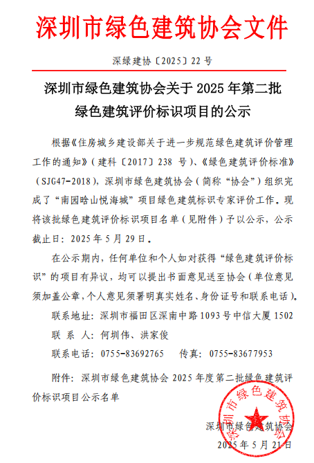 深圳市綠色建筑協(xié)會關(guān)于2025年第二批綠色建筑評價(jià)標(biāo)識項(xiàng)目的公示