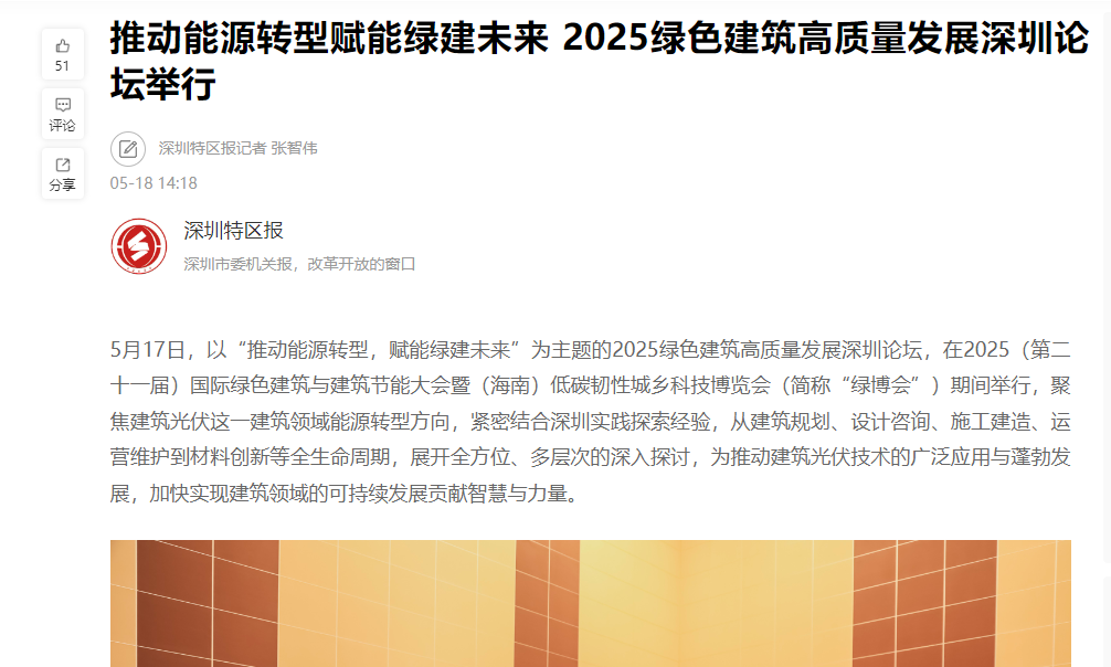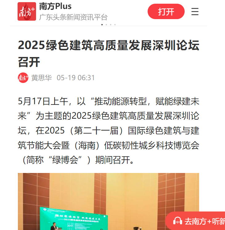 5月16至17日,2025(第二十一屆)國際綠色建筑與建筑節(jié)能大會暨(海南)低碳韌性城鄉(xiāng)科技博覽會(簡稱“綠博會”)在海南國際會展中心隆重召開。大會期間,為助推深圳以及粵港澳大灣區(qū)綠色建筑高質(zhì)量發(fā)展,深圳市綠色建筑協(xié)會聯(lián)合粵港澳地區(qū)同行業(yè)組織和有關(guān)單位舉辦“推動能源轉(zhuǎn)型,賦能綠建未來——2025綠色建筑高質(zhì)量發(fā)展深圳論壇”“發(fā)展新質(zhì)生產(chǎn)力,推動產(chǎn)業(yè)再升級——粵港澳大灣區(qū)綠色建筑產(chǎn)業(yè)發(fā)展高峰論壇”兩個專題論壇,備受媒體關(guān)注,吸引南方日報、南方都市報、深圳商報、深圳特區(qū)報、新浪網(wǎng)、鳳凰網(wǎng)等多家媒體競相報道。