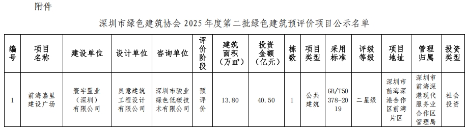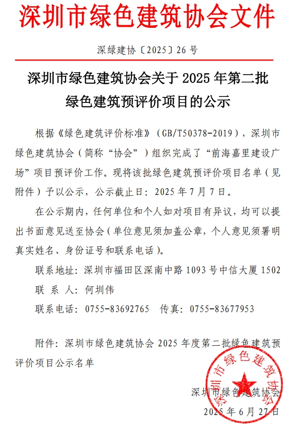 深圳市綠色建筑協(xié)會(huì)關(guān)于2025年第二批綠色建筑預(yù)評(píng)價(jià)項(xiàng)目的公示