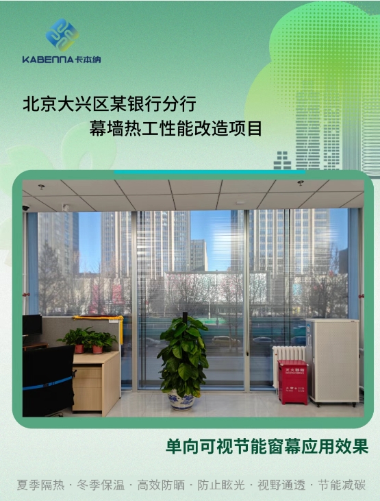 卡本納深耕建筑幕墻與窗節(jié)能改造領(lǐng)域,推出的單向可視節(jié)能窗幕,直擊幕墻與窗熱工性能衰退與不可調(diào)兩大核心痛點。窗幕通過先進納米膜材與控制組件實現(xiàn)幕墻熱工參數(shù)動態(tài)調(diào)節(jié),夏季減少40-50%室內(nèi)得熱、冬季減少20-30%室內(nèi)熱量流失,以主動調(diào)節(jié)機制逆轉(zhuǎn)性能衰減趨勢,從根本上破解建筑能耗攀升、熱舒適性差等頑疾。作為2021年獲國家發(fā)明專利的革命性成果,其創(chuàng)新價值獲多項權(quán)威認證背書:通過住建部建設(shè)行業(yè)科技成果評估、斬獲北京市五部委聯(lián)合頒發(fā)的新技術(shù)新產(chǎn)品證書、入選北京市發(fā)改委綠色低碳先進技術(shù)推薦目錄。目前窗幕已應(yīng)用于全國200余個幕墻改造項目,被業(yè)內(nèi)專家、設(shè)計師和業(yè)主廣泛認可,既以技術(shù)突破印證創(chuàng)新實力,更憑市場滲透力彰顯強勁發(fā)展?jié)摿Γ掷m(xù)贏得客戶高度贊譽。