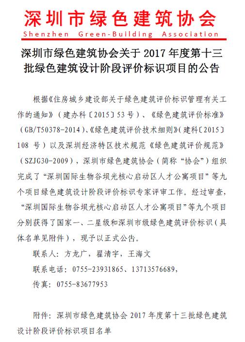 關(guān)于2017年度第十三批綠色建筑設(shè)計階段評價標(biāo)識項目的公告