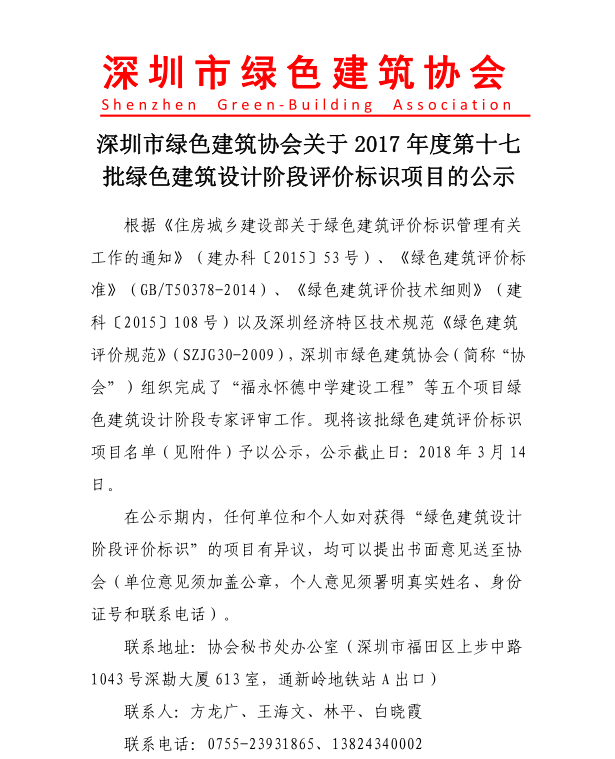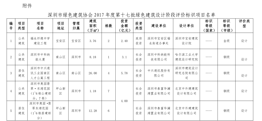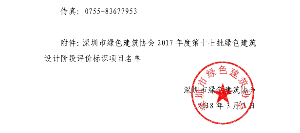 深圳市綠色建筑協(xié)會關(guān)于2017年度第十七批綠色建筑設(shè)計(jì)階段評價(jià)標(biāo)識項(xiàng)目的公示