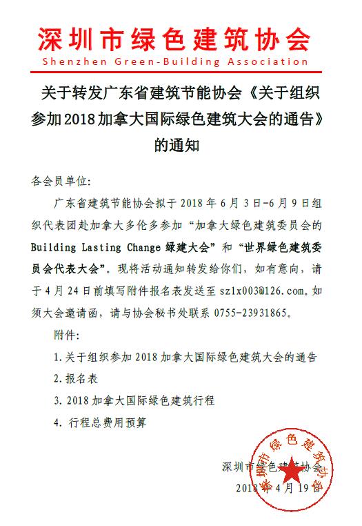 關(guān)于轉(zhuǎn)發(fā)廣東省建筑節(jié)能協(xié)會(huì)《關(guān)于組織參加2018加拿大國際綠色建筑大會(huì)的通告》的通知