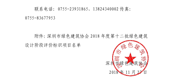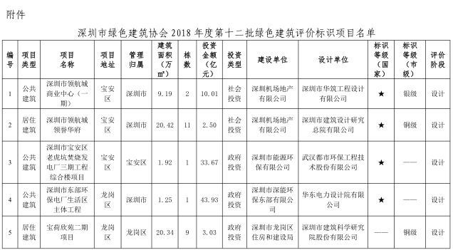 深圳市綠色建筑協(xié)會關(guān)于2018年度第十二批綠色建筑評價標識項目的公示