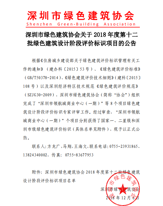 深圳市綠色建筑協(xié)會關(guān)于2018年度第十二批綠色建筑評價標(biāo)識項目的公告