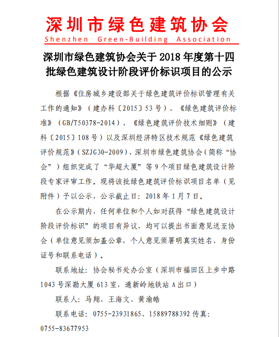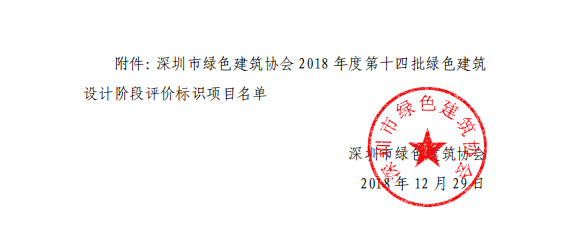 深圳市綠色建筑協(xié)會(huì)關(guān)于2018年度第十四批綠色建筑評(píng)價(jià)標(biāo)識(shí)項(xiàng)目的公示