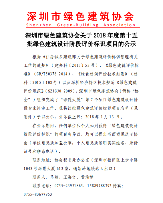 深圳市綠色建筑協(xié)會關(guān)于2018年度第十五批綠色建筑評價標識項目的公示