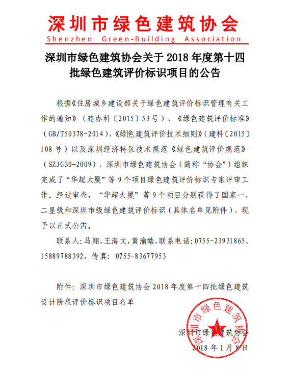 深圳市綠色建筑協(xié)會關(guān)于2018年度第十四批綠色建筑評價(jià)標(biāo)識項(xiàng)目的公告