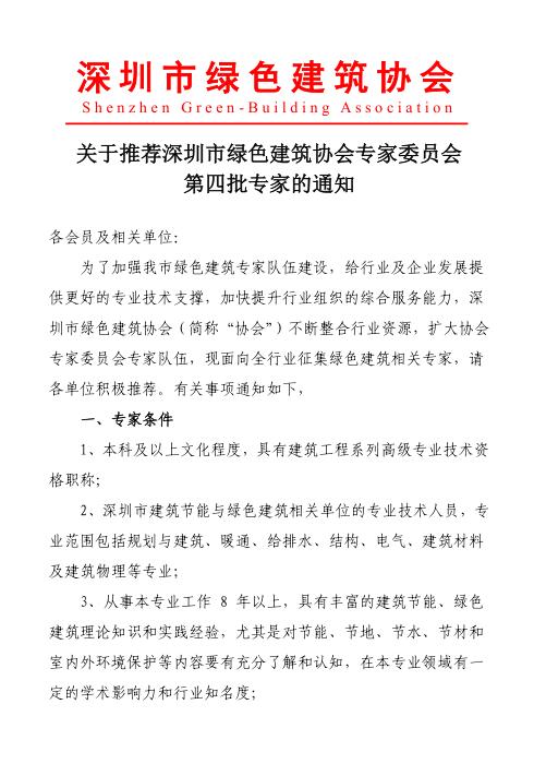 關(guān)于推薦深圳市綠色建筑協(xié)會(huì)專(zhuān)家委員會(huì)第四批專(zhuān)家的通知