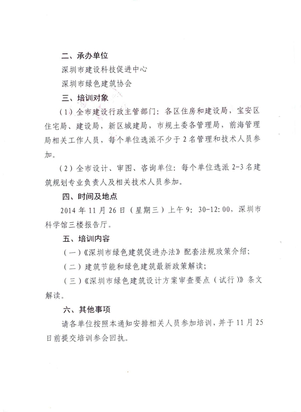 深圳市住房和建設(shè)局關(guān)于開展2014《深圳市綠色建筑促進辦法》相關(guān)配套政策專題宣貫培訓會的通知
