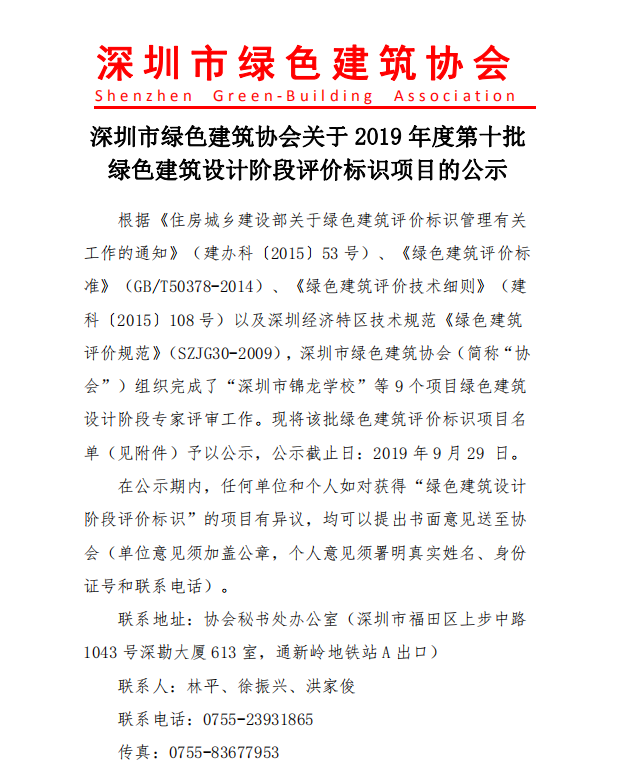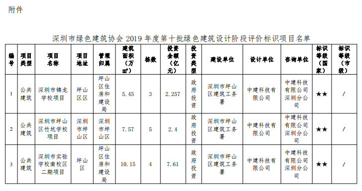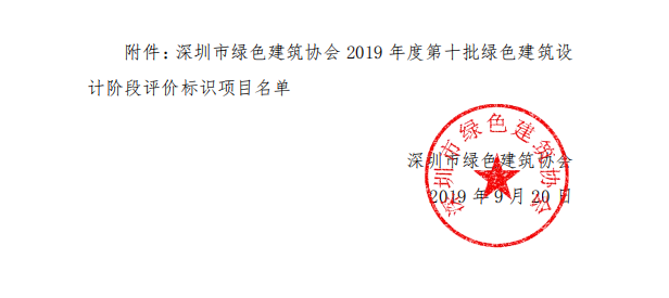 深圳市綠色建筑協(xié)會關(guān)于2019年度第十批綠色建筑設(shè)計階段評價標(biāo)識項(xiàng)目的公示
