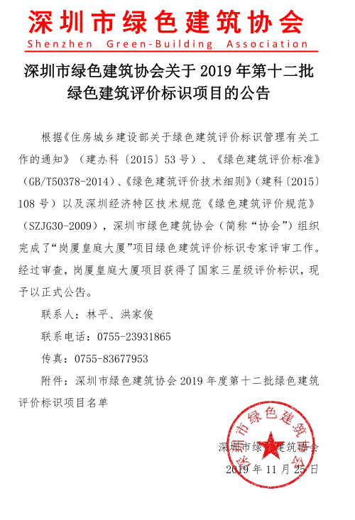 深圳市綠色建筑協(xié)會(huì)關(guān)于2019年度第十二批綠色建筑評(píng)價(jià)標(biāo)識(shí)項(xiàng)目的公告