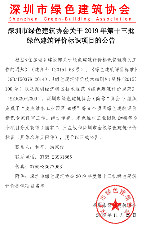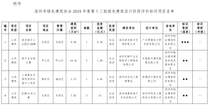 深圳市綠色建筑協(xié)會(huì)關(guān)于2019年度第十三批綠色建筑評(píng)價(jià)標(biāo)識(shí)項(xiàng)目的公告