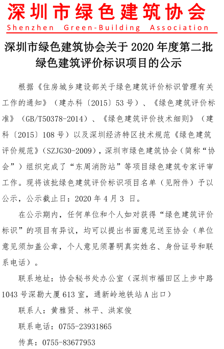 深圳市綠色建筑協(xié)會關于2020年度第二批綠色建筑評價標識項目的公示