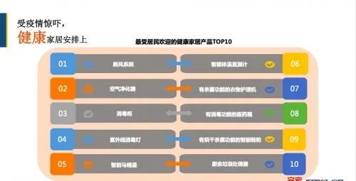 值得注意的是TOP榜中,消毒類健康家居產(chǎn)品多達(dá)到6種,分別是消毒柜、紫外線消毒燈、智能馬桶蓋、有殺菌功能的衣物護(hù)理機(jī)和有殺毒功能的智能鞋柜。同時也說明了,在家庭環(huán)境中,用戶對居家衛(wèi)生情況有了深刻認(rèn)知,關(guān)注度幾乎空前。