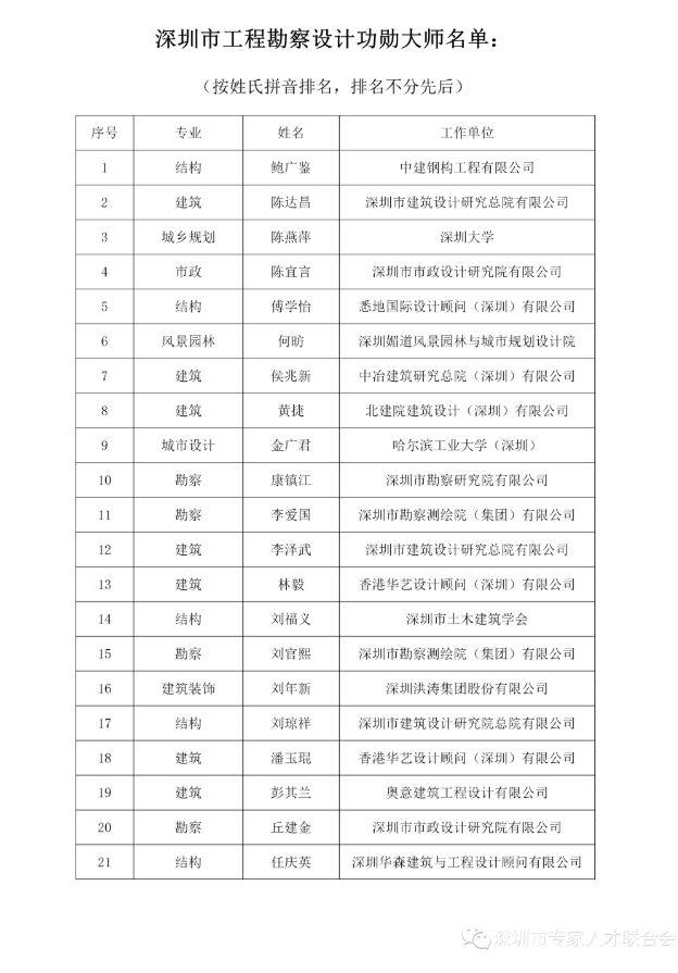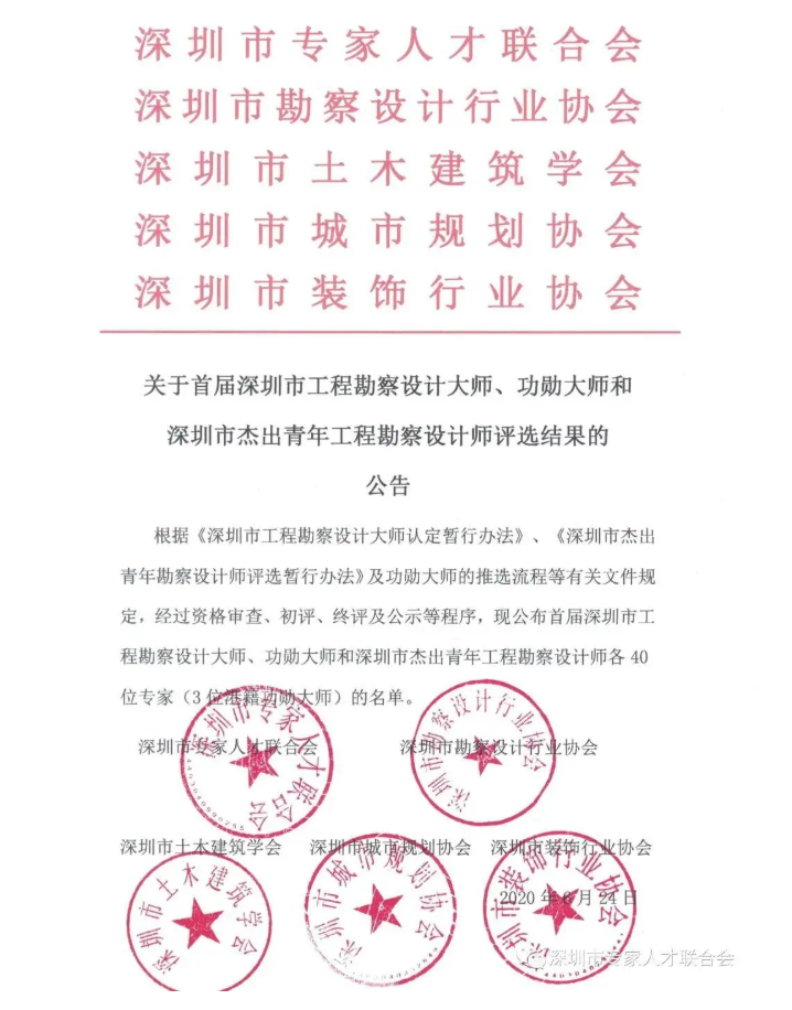 為表彰對深圳經(jīng)濟特區(qū)四十年的發(fā)展建設(shè)作出突出貢獻的工程勘察設(shè)計人員,樹立工程勘察設(shè)計人才標(biāo)桿,助推行業(yè)發(fā)展和深圳“設(shè)計之都”品牌打造,深圳市專家人才聯(lián)合會、深圳市勘察設(shè)計行業(yè)協(xié)會、深圳市土木建筑學(xué)會、深圳市城市規(guī)劃協(xié)會、深圳市裝飾行業(yè)協(xié)會五家機構(gòu)于2020年聯(lián)合開展首屆深圳市工程勘察設(shè)計大師、功勛大師認(rèn)定和深圳市杰出青年工程勘察設(shè)計師評選活動。