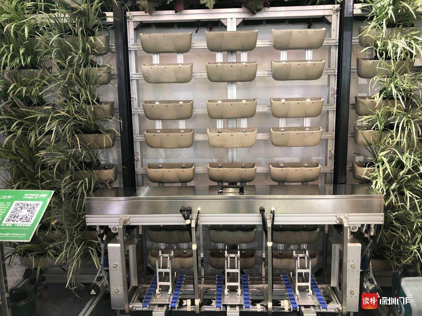 花盆安裝在金屬腳手架上,花盆為標(biāo)準(zhǔn)化設(shè)計(jì),由機(jī)器人取放植物并對(duì)其修剪,剪下的枝葉通過(guò)傳送帶被統(tǒng)一收納。墻面上還設(shè)置由給排水管等形成的灌溉系統(tǒng),當(dāng)植物生長(zhǎng)所需的水分不足,水泵、電磁閥自動(dòng)開(kāi)啟,灌溉至土壤濕度達(dá)到預(yù)設(shè)值。