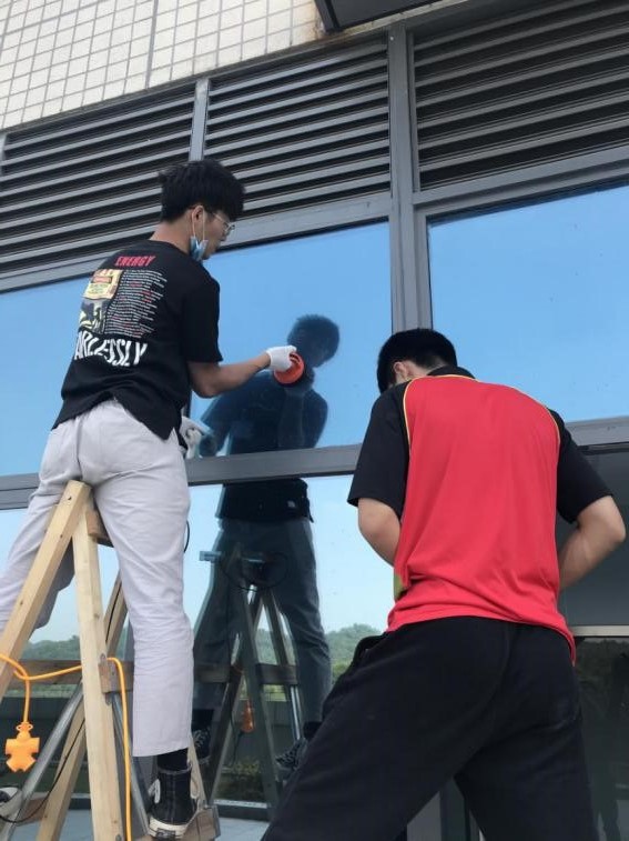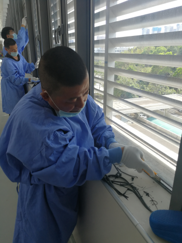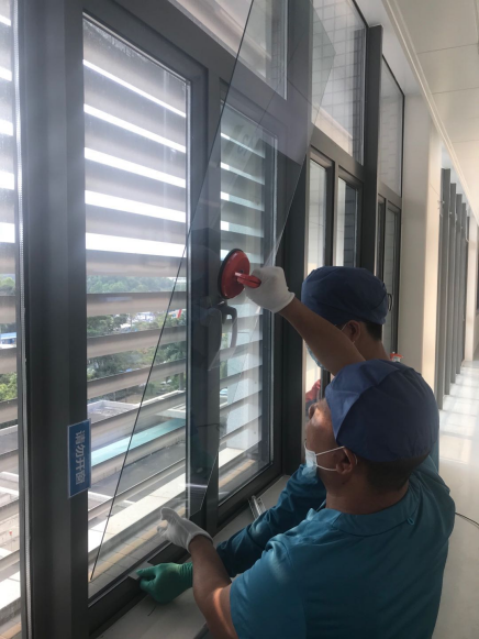 2.4月22日,完成剩余基面的清理工作,同時(shí)開始已完成清理工作的基面抗菌隔熱玻璃的黏貼工作。至下午六點(diǎn)半,剩余最上面一排玻璃未施工密封膠(約占40%)。