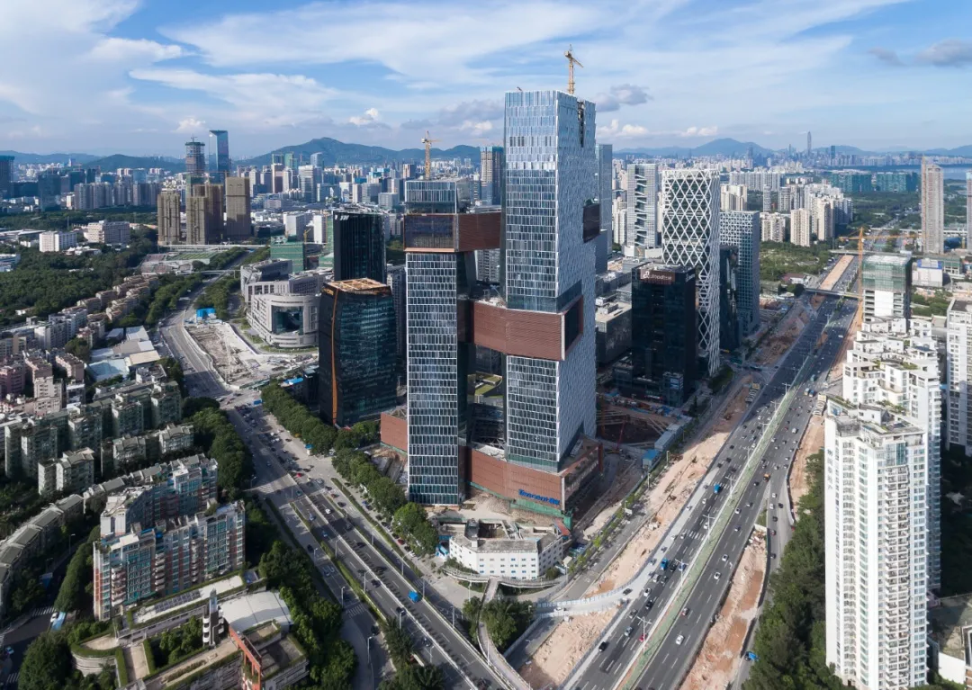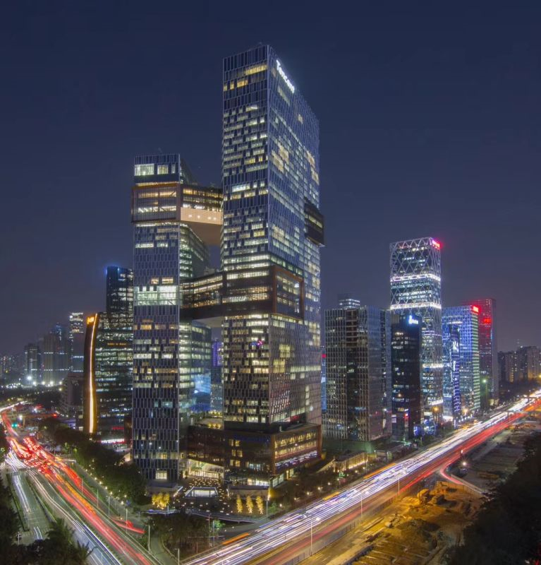 騰訊濱海大廈位于深圳市南山區(qū)海天二路33號,南臨濱海大道、西臨后海大道,總用地面積為 18650.95㎡,總建筑面積 341431.8㎡,地上建筑面積 274034.65㎡,地下建筑面積 67397.33 ㎡,容積率為 14.28,建筑覆蓋率 38.90%。建筑主要功能為研發(fā)、商業(yè)、食堂、文體活動設(shè)施等。大廈分為南北兩座塔樓,其中南塔樓50層,建筑高度244.10米,北塔樓39層,建筑高度為194.85米。南北塔樓分別在一~五層、二十一~二十五層、和三十四層~三十七層相連,形成低、中、高區(qū)連接層承接不同功能業(yè)態(tài)。