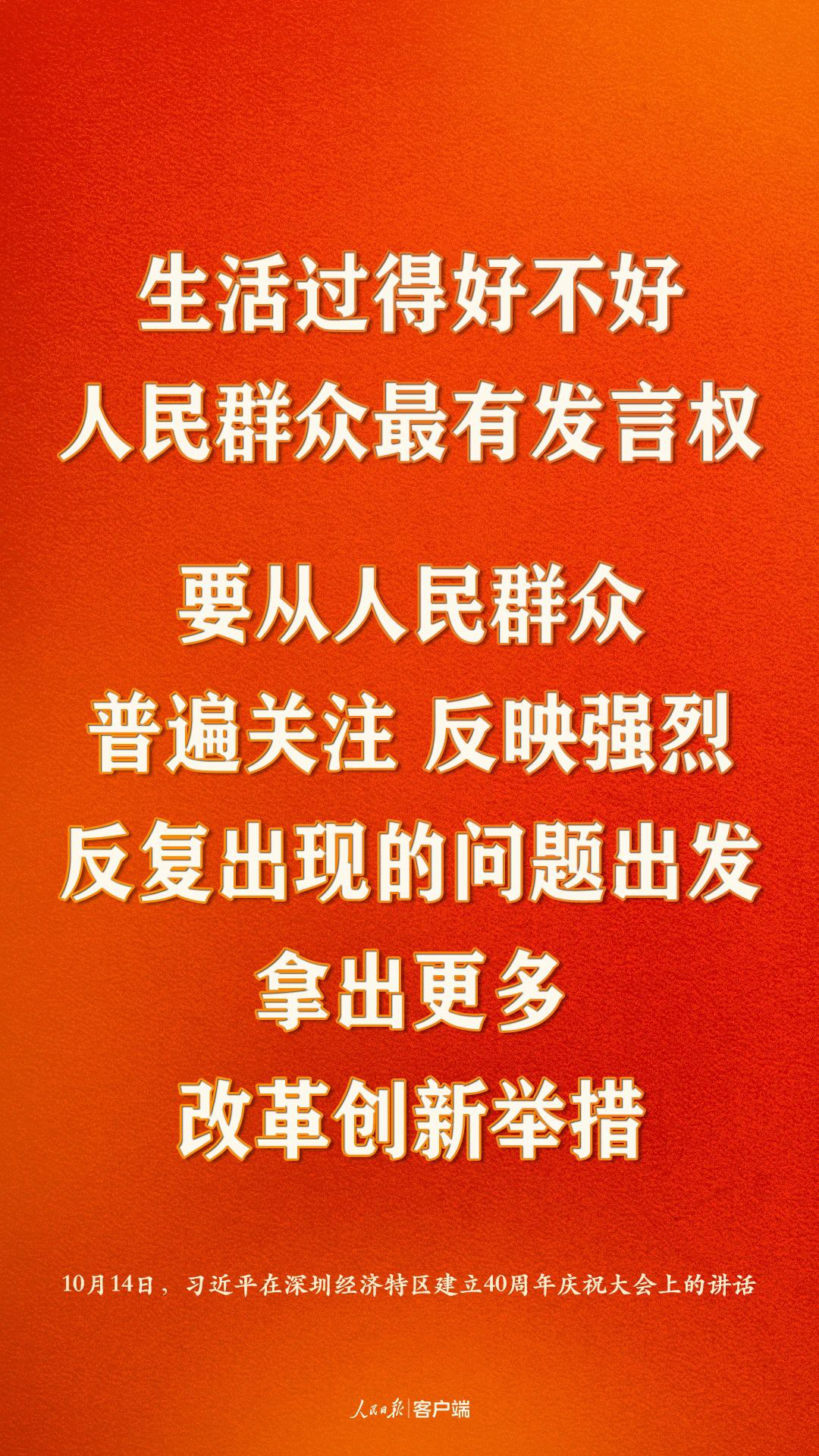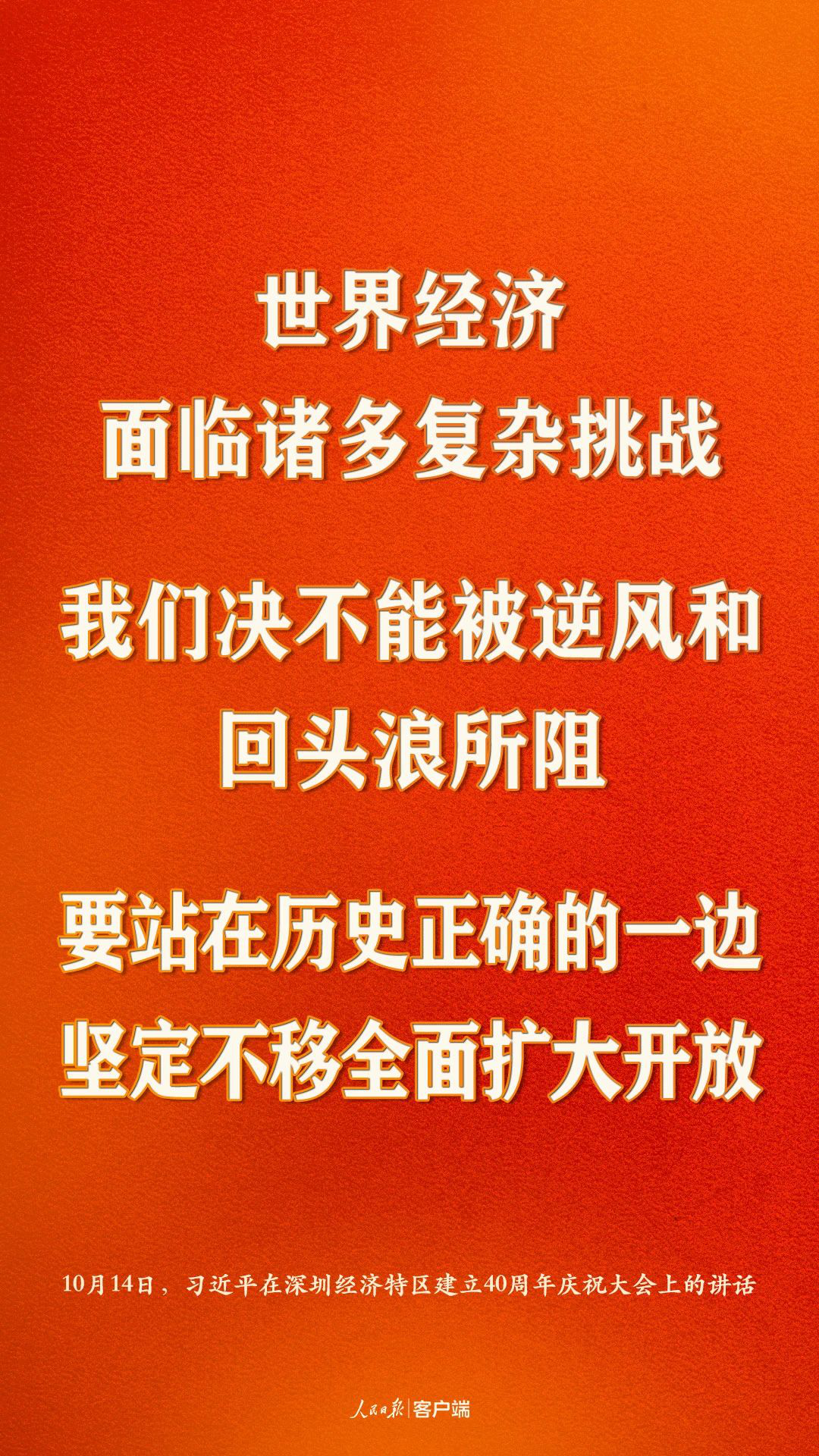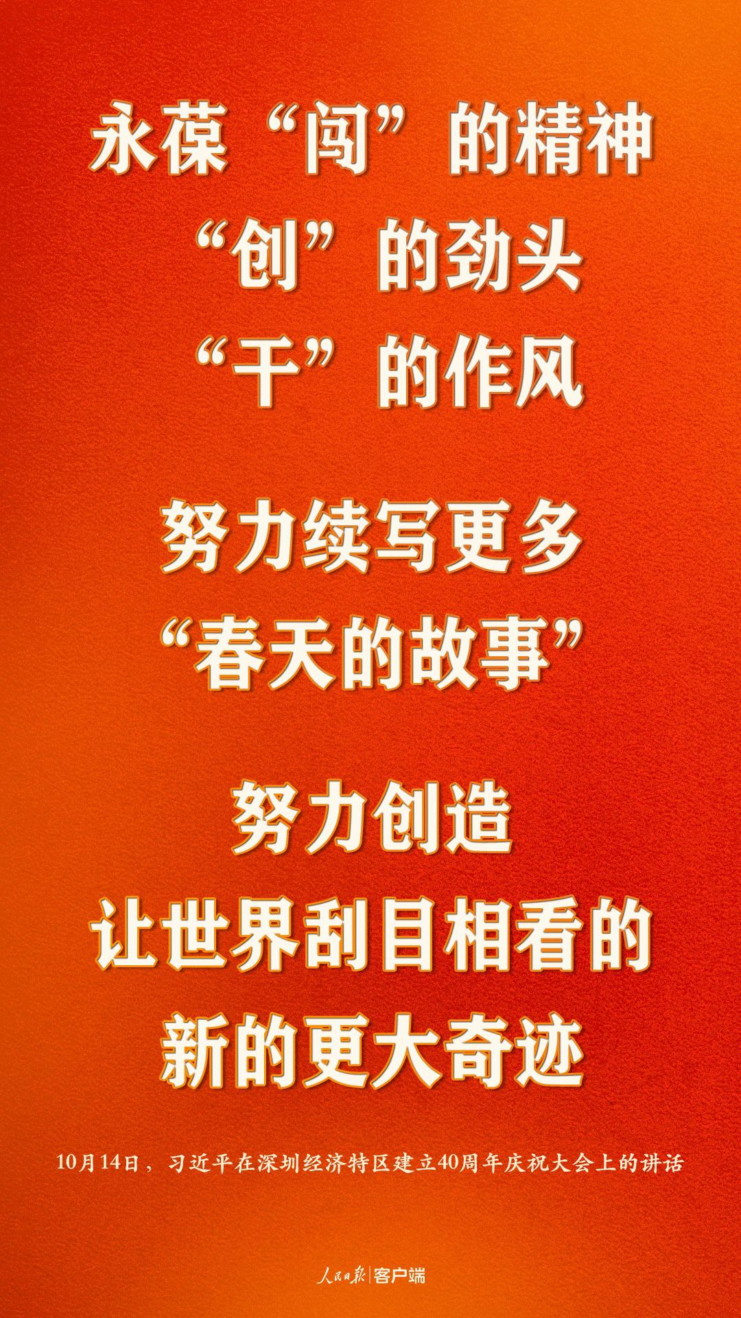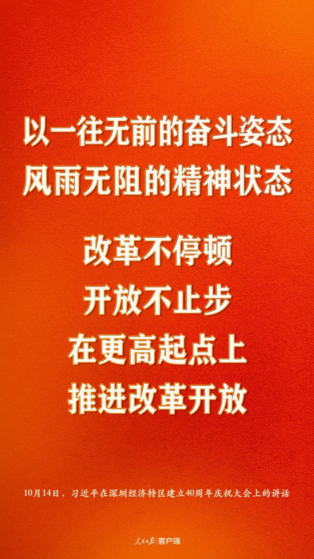 深圳經(jīng)濟(jì)特區(qū)建立40周年慶祝大會(huì)14日上午在廣東省深圳市隆重舉行。中共中央總書記、國(guó)家主席、中央軍委主席習(xí)近平在會(huì)上發(fā)表重要講話,強(qiáng)調(diào)要高舉中國(guó)特色社會(huì)主義偉大旗幟,統(tǒng)籌推進(jìn)“五位一體”總體布局,協(xié)調(diào)推進(jìn)“四個(gè)全面”戰(zhàn)略布局,從我國(guó)進(jìn)入新發(fā)展階段大局出發(fā),落實(shí)新發(fā)展理念,緊扣推動(dòng)高質(zhì)量發(fā)展、構(gòu)建新發(fā)展格局,以一往無前的奮斗姿態(tài)、風(fēng)雨無阻的精神狀態(tài),改革不停頓,開放不止步,在更高起點(diǎn)上推進(jìn)改革開放,推動(dòng)經(jīng)濟(jì)特區(qū)工作開創(chuàng)新局面,為全面建設(shè)社會(huì)主義現(xiàn)代化國(guó)家、實(shí)現(xiàn)第二個(gè)百年奮斗目標(biāo)作出新的更大的貢獻(xiàn)。