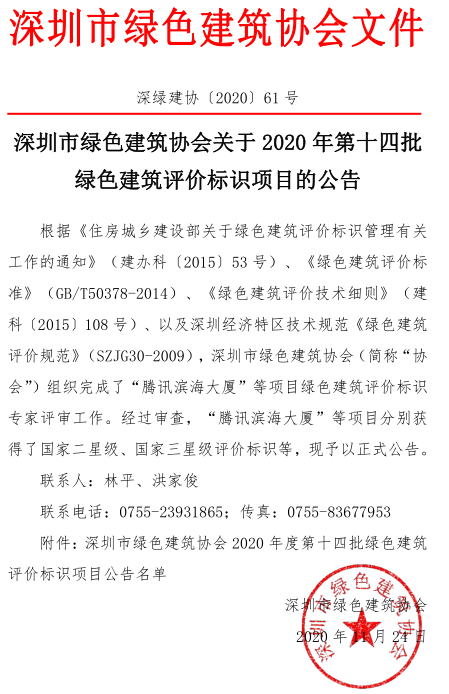 深圳市綠色建筑協(xié)會關于2020年度第十四批綠色建筑評價標識項目的公告
