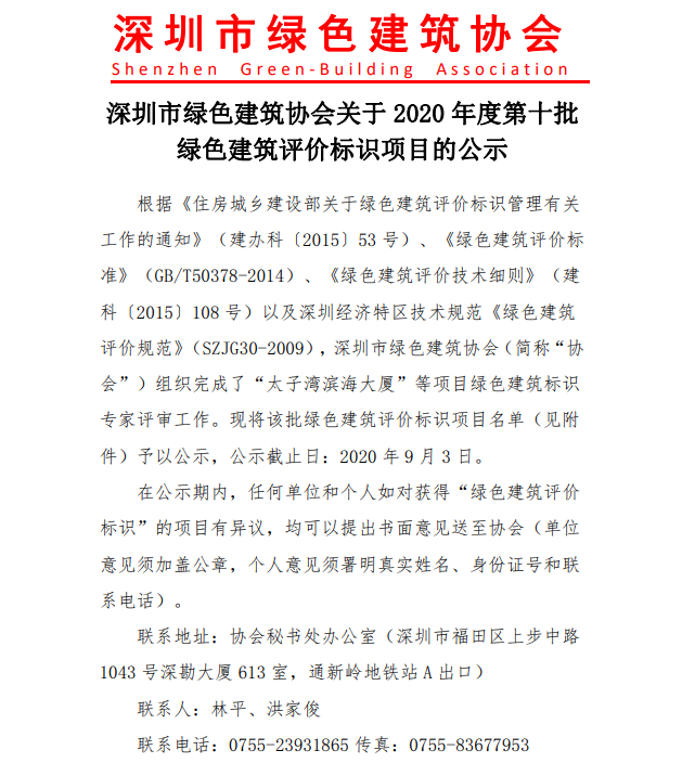 深圳市綠色建筑協(xié)會(huì)關(guān)于2020年度第十批綠色建筑設(shè)計(jì)階段評(píng)價(jià)標(biāo)識(shí)項(xiàng)目的公示