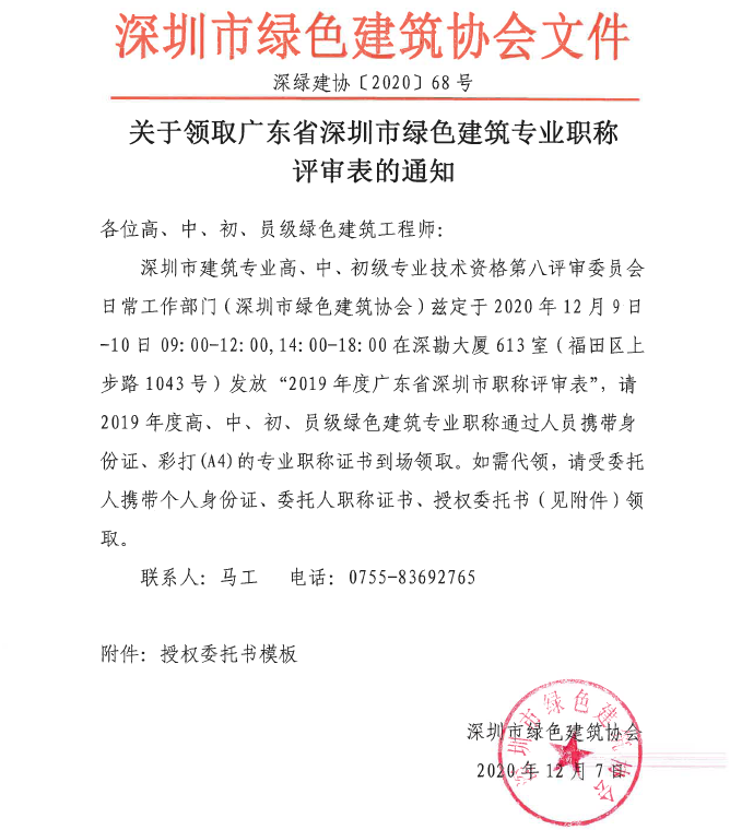 關(guān)于領(lǐng)取廣東省深圳市綠色建筑專業(yè)職稱評(píng)審表的通知