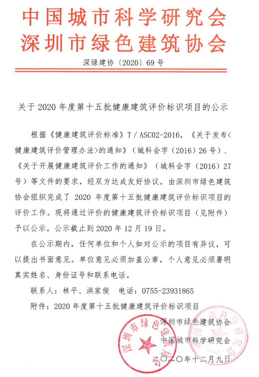 關(guān)于2020年度第十五批健康建筑評價標(biāo)識項(xiàng)目的公示