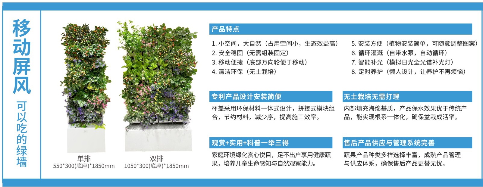移動屏風(fēng)是一款可移動綠化墻,小空間,安裝方便,自帶水泵,自動循環(huán),拼接式模塊組合,杯蓋采用環(huán)保材料一體式設(shè)計(jì),節(jié)約材料,提高施工效率,安全穩(wěn)固,底部萬向輪便于移動,無土栽培,清潔環(huán)保,內(nèi)部填充海綿基質(zhì),產(chǎn)品保水效果優(yōu)于傳統(tǒng)產(chǎn)品,能實(shí)現(xiàn)根系一體化,確保盆栽成活率,落地?cái)[放,用于辦公,居家各種場所,植物與果蔬選擇品種豐富,成熟產(chǎn)品管理與供應(yīng)體系,確保售后產(chǎn)品更替無憂。