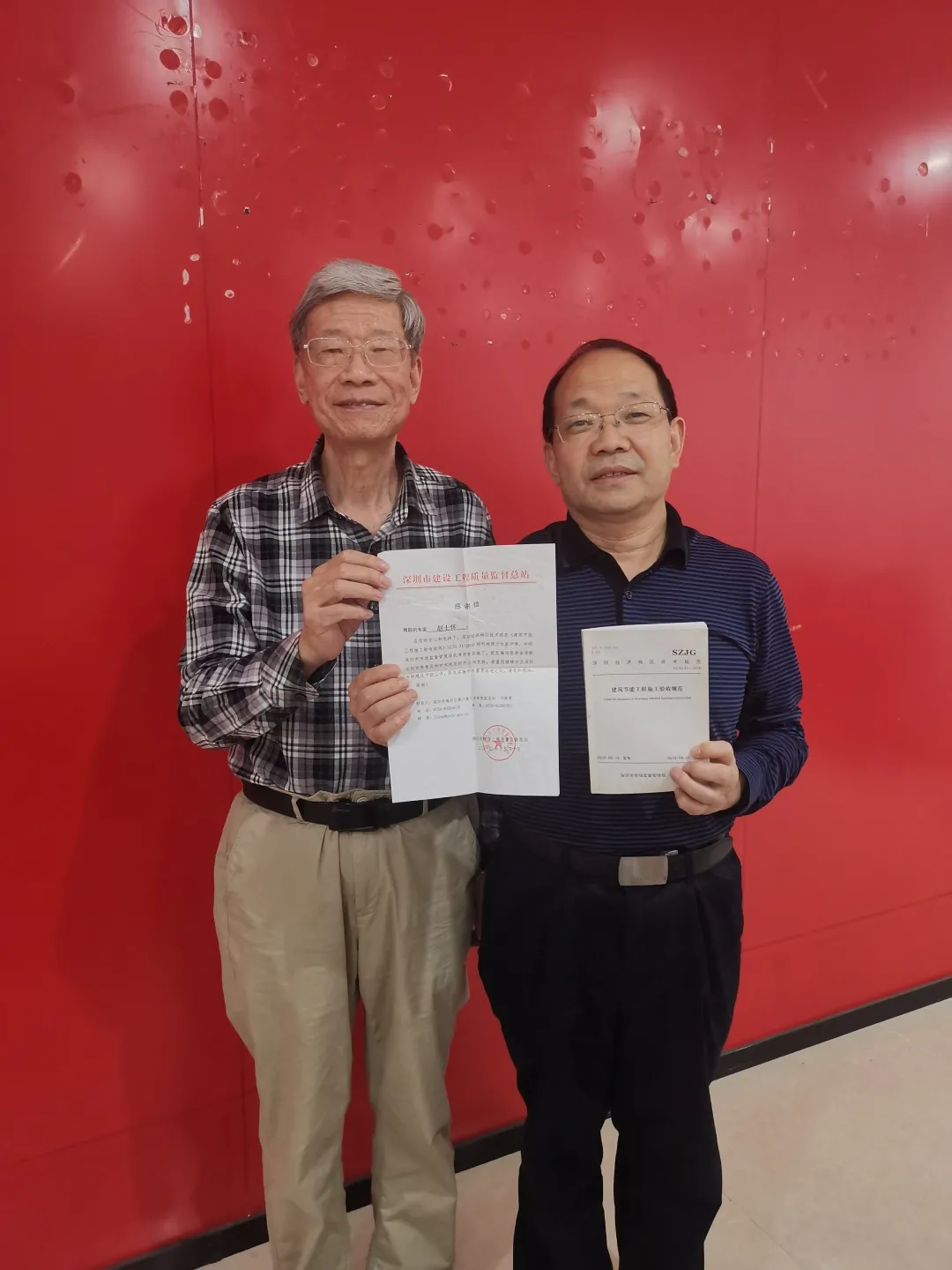 福建省建筑科學研究院顧問總工趙士懷(左)手捧珍藏10年的感謝信與發(fā)信人——深圳市質(zhì)監(jiān)總站主任劉緒普(右)合影留念