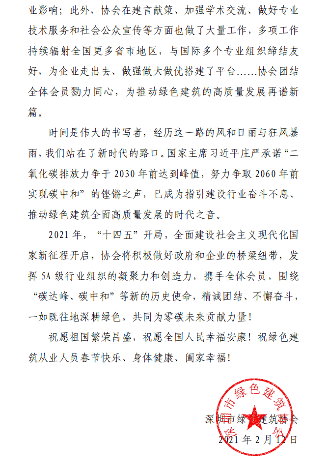 祝愿深圳綠色建筑協(xié)會(huì)全體家人在新的一年,沿著綠色設(shè)計(jì)、綠色制造、綠色施工、綠色運(yùn)營的康莊大道穩(wěn)步前行,綠協(xié)之家有你、有我、有他,有大家!家家幸福安康、家家興旺發(fā)達(dá)!