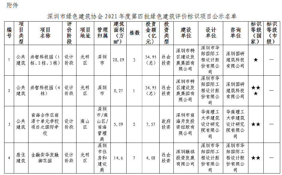 深圳市綠色建筑協(xié)會關(guān)于2021年第四批綠色建筑評價標(biāo)識項目的公示