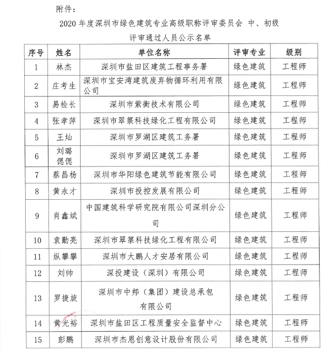 2020年度深圳市綠色建筑專業(yè)高級(jí)職稱評審委員會(huì)中、初級(jí)評審?fù)ㄟ^人員公示