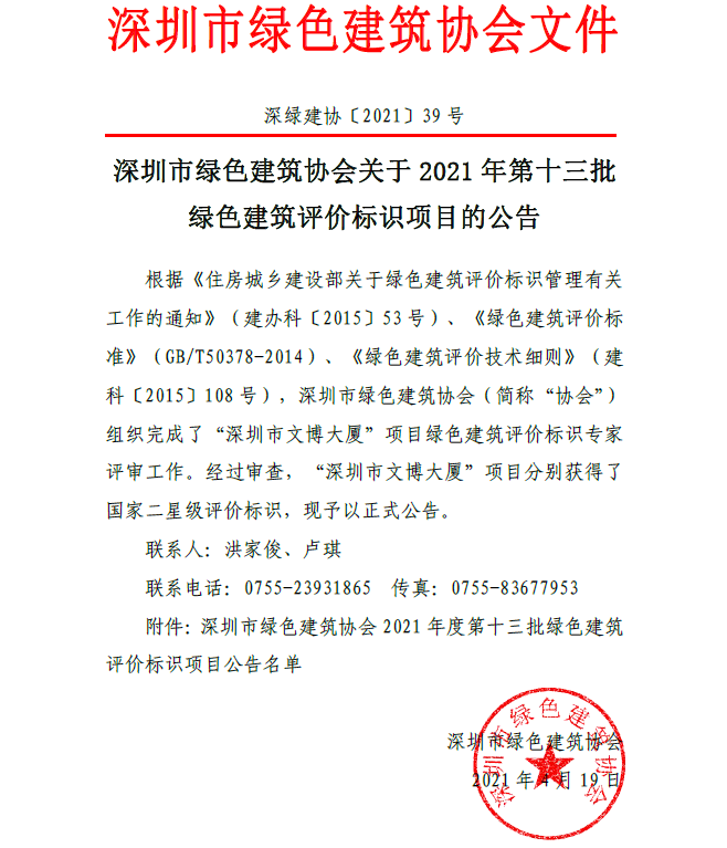 深圳市綠色建筑協(xié)會(huì)關(guān)于2021 年第十三批 綠色建筑評(píng)價(jià)標(biāo)識(shí)項(xiàng)目的公告