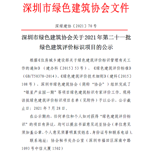 深圳市綠色建筑協(xié)會(huì)關(guān)于2021年第二十一批綠色建筑評(píng)價(jià)標(biāo)識(shí)項(xiàng)目的公示