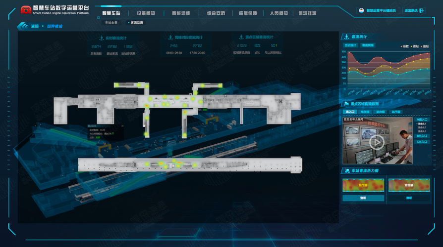 以觀訊信息自主研發(fā)的智慧車站三維綜合管理平臺(tái),以車站的BIM和GIS三維數(shù)據(jù)作為基礎(chǔ)數(shù)據(jù),與車站的各為聯(lián)網(wǎng)數(shù)據(jù)進(jìn)行基礎(chǔ),實(shí)現(xiàn)三維可視化的動(dòng)態(tài)管理。主要集成了視頻監(jiān)控系統(tǒng)、安檢系統(tǒng)、AFC系統(tǒng)、電梯控制系統(tǒng)、門禁系統(tǒng)、智慧消防系統(tǒng)、智能環(huán)控系統(tǒng)、能耗分析等系統(tǒng)。實(shí)現(xiàn)車站運(yùn)營對(duì)設(shè)備、環(huán)境、能耗、客人、安檢的實(shí)時(shí)監(jiān)測(cè)。
