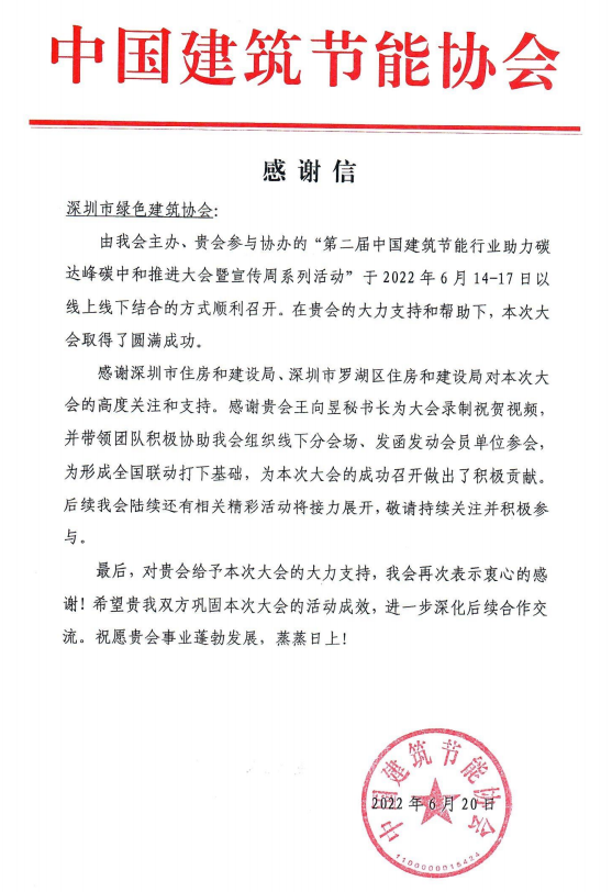 會(huì)議結(jié)束后,我協(xié)會(huì)作為深圳分會(huì)場組織方,收到中國建筑節(jié)能協(xié)會(huì)發(fā)來的感謝信。協(xié)會(huì)將繼續(xù)沿著綠色發(fā)展的方向,矢志奮斗,為助力我國3060碳目標(biāo)達(dá)成貢獻(xiàn)深圳力量!