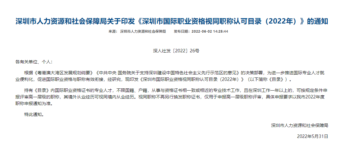 近日,為進一步推進國際專業(yè)人才就業(yè)便利化,促進國際職業(yè)資格與職稱有效銜接,深圳市人力資源和社會保障局印發(fā)《深圳市國際職業(yè)資格視同職稱認可目錄(2022年)》(以下簡稱《目錄》),試點開展國際職業(yè)資格視同職稱認可工作。
