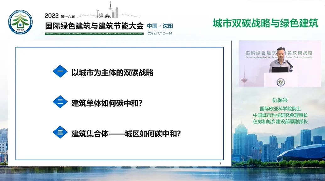 仇保興部長在報告中表示,根據(jù)聯(lián)合國的研究結果顯示,城市在人為溫室氣體排放中占比達75%,以城市為主體開展“雙碳戰(zhàn)略”具有明顯優(yōu)勢,可使“從下而上”“生成”碳中和體系,與“從上而下”“構成”行業(yè)碳中和體系進行互補協(xié)同。建筑業(yè)歷來是能耗大戶,是能否實現(xiàn)"雙碳"目標的關鍵領域之一。通過梳理建筑單體和建筑集合體(城區(qū))的耗能情況和碳排放特點,他指出,從建筑全生命周期來看,要實現(xiàn)建筑乃至城區(qū)的碳中和,需要利用正能建筑、立體園林建筑、分布式污水處理、社區(qū)“微電網(wǎng)”等創(chuàng)新性事件,夯實建筑減碳實施基礎,引導建筑和城區(qū)從易到難、分階有序實現(xiàn)高質量綠色轉型。