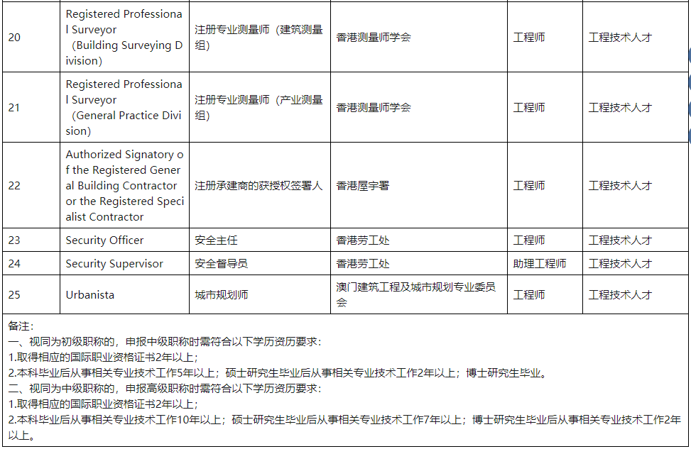 《目錄》指出,LEED AP、BREEAM AP、BREEAM INC Assessor、BREEAM In-Use Assessor、香港注冊建筑師、香港注冊專業(yè)工程師、香港注冊專業(yè)規(guī)劃師等國際職業(yè)資質(zhì)(詳見附表),均可視為工程類中級職稱。如滿足學(xué)歷資歷等要求,可直接申報(bào)副高級工程師職稱。