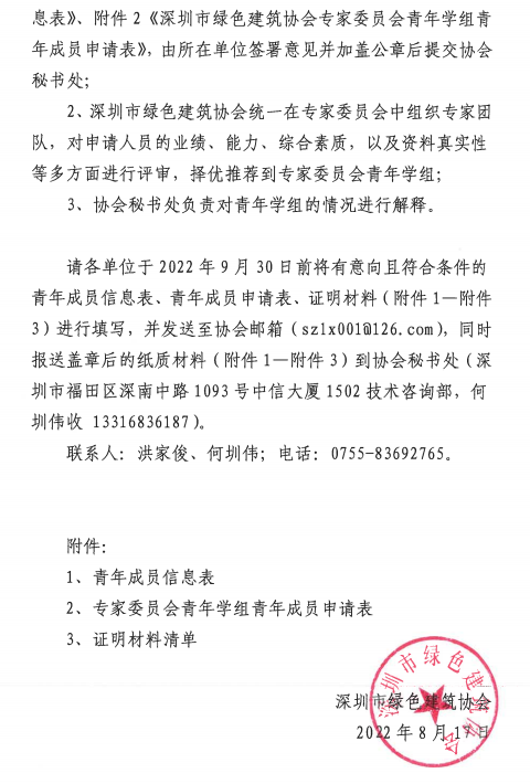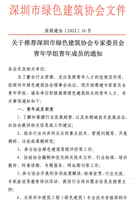 關于推薦深圳市綠色建筑協(xié)會專家委員會青年學組青年成員的通知
